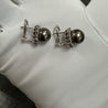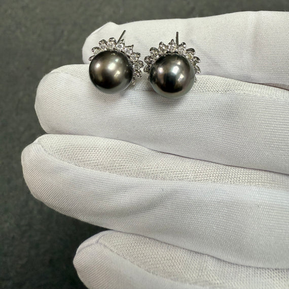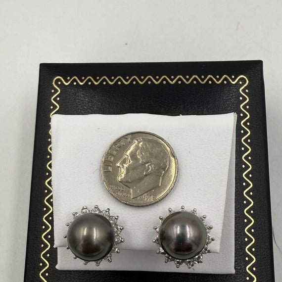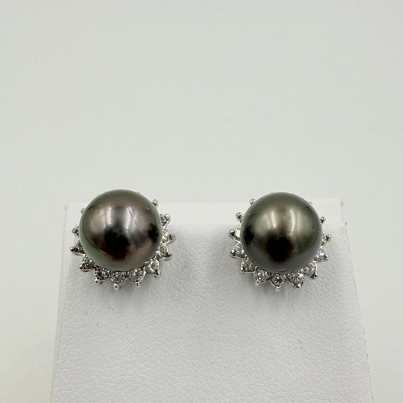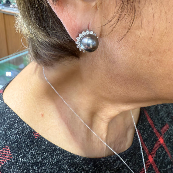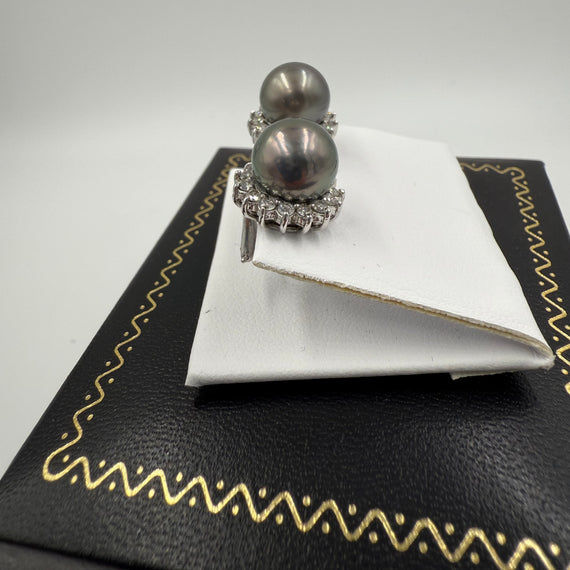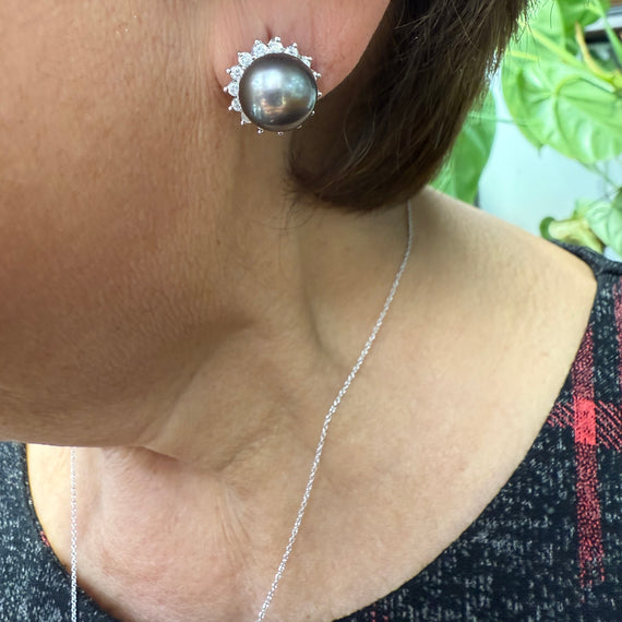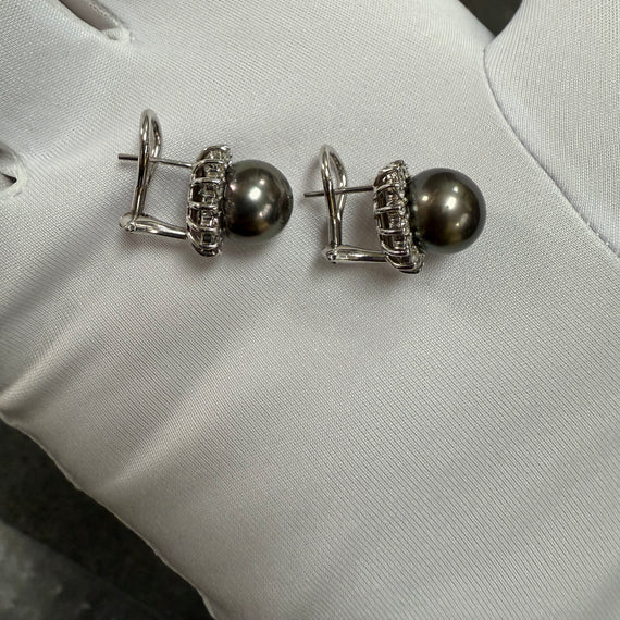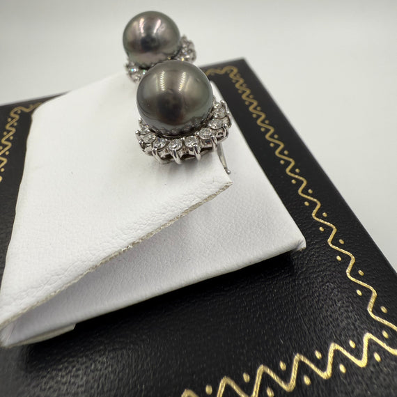 The Tahitian Pearl and Diamond White Gold Earrings were made around 2000. Rich dark grey Tahitian Pearls are surrounded by near colorless round diamonds. A very elegant and simple pair of earrings. Great to gift to someone or perhaps yourself.
