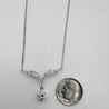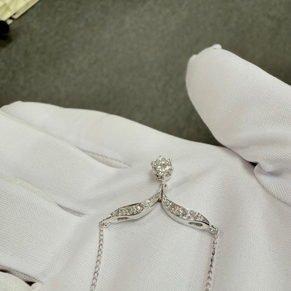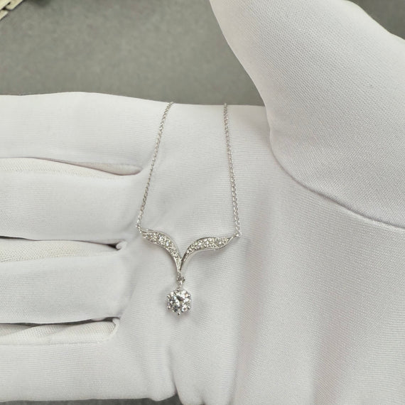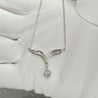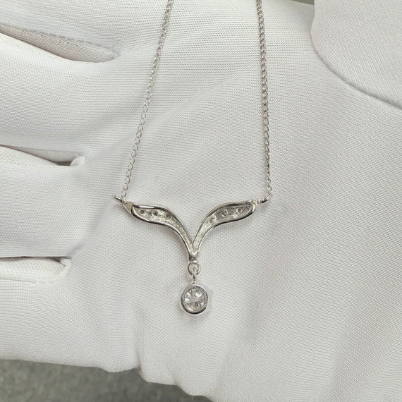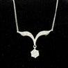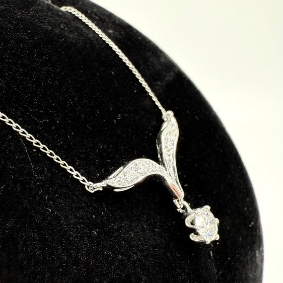 The Vintage Diamond Drop 14k White Gold Necklace was made in the 1950s. This lovely necklace was designed as 2 outstretched diamond wings with a dangling diamond drop on the bottom. Its look is elegant and delicate. Which makes for a great gift for someone or perhaps for yourself!