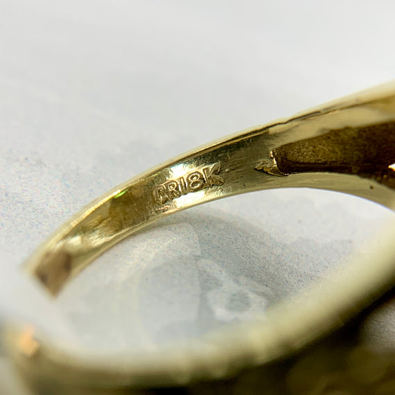 The Cindy Royce Green Tourmaline and Diamond 18k Yellow Gold Ring was made in the 1980s.  It has a classical arrangement of marquise-shaped green Tourmalines and round diamonds that make this ring very elegant.  And the bold size of this ring makes a real statement.  It is also worthwhile noting that high quality materials and craftmanship are only two of the many excellent characteristics associated with any Cindy Royce jewel.