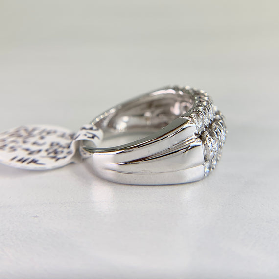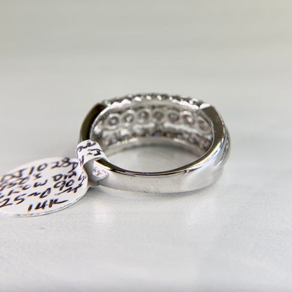 The Three Row Diamond White Gold Band Ring was made in the 1950s. Three rows of round brilliant cut diamonds are set in 14k white gold. The ring can be your wedding band or on your right hand; it can just be an everyday ring. It has a nice low profile which makes it easy to wear.