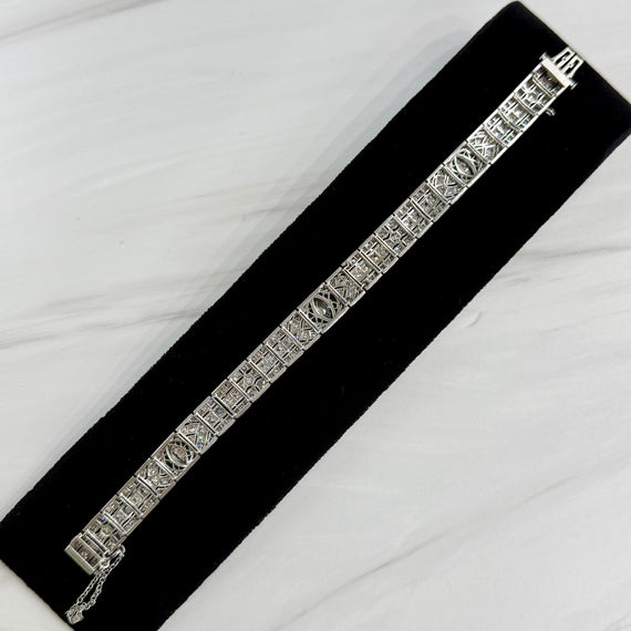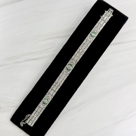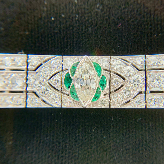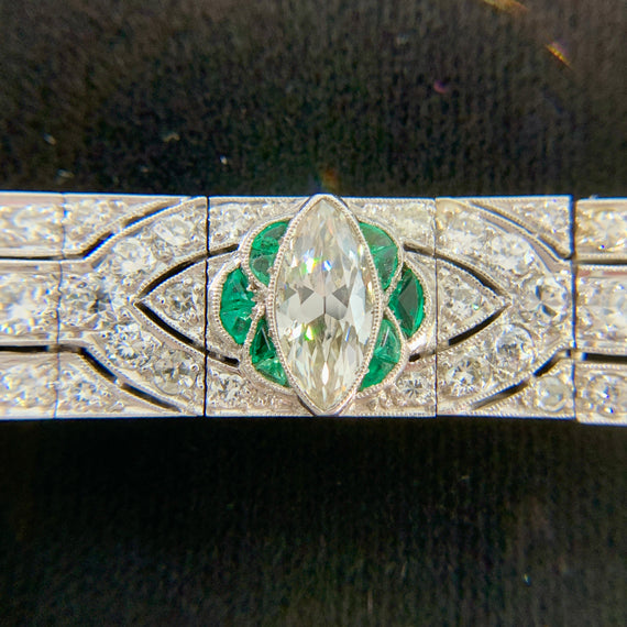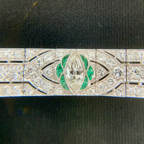 Incredible 1920's Art Deco bracelet at an unusual length of 7.5 inches! The stones are a mix of old cut marquise diamonds, old european cut diamonds and natural emeralds. This is an incredible piece with so much history and the diamonds are very clean and sparkle in a way that only old cut diamonds can.