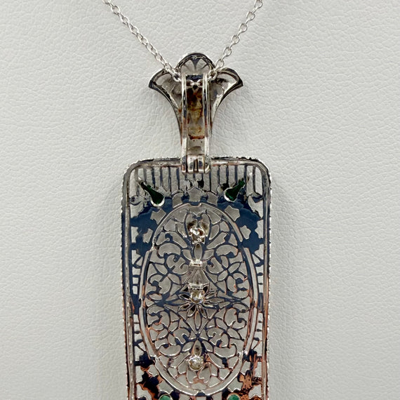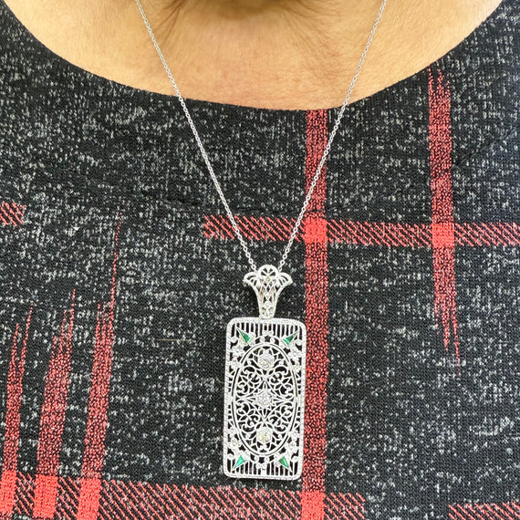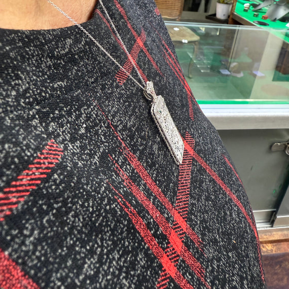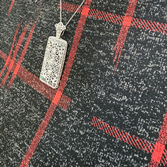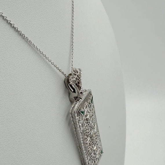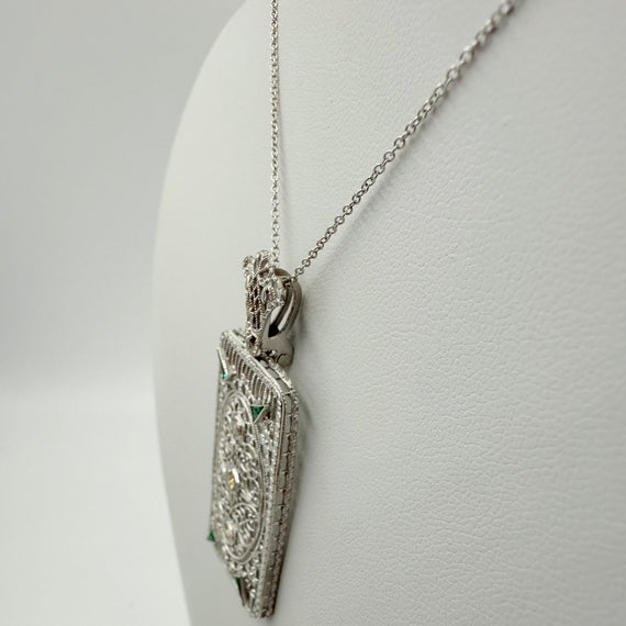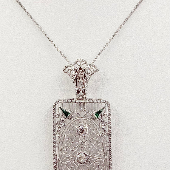 This Art Deco Diamond and Filigree 14k White Gold Pendant Necklace was made in the 1930s. The design and filigree work is outstanding in this pendant. There are 3 diamonds and 4 accent green stones that catch the light just in the right way. It can be worn all the time or for dress up. Makes a great gift for someone or perhaps yourself!