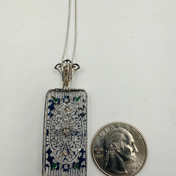 1930s Art Deco Filigree Diamond 14k White Gold Pendant Necklace.