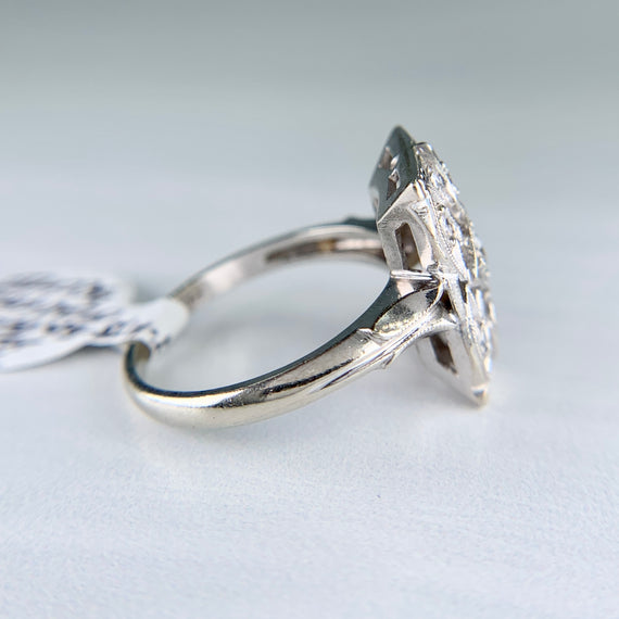 Beautiful Art Deco ring circa 1930's with an Old European Cut diamond in the center and single cut diamonds along the border. A wonderful and sparkly piece of history.