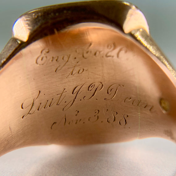 Antique Sardonyx intaglio ring with engraving on the underside of the head that reads "Engine co 20 to Lieut J.P. Dean Nov 2 '88" A very special ring that is in wonderful condition for being almost 138 years old!