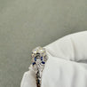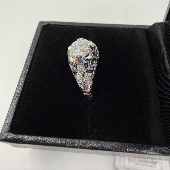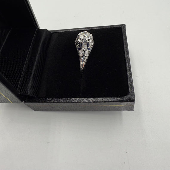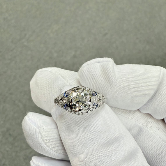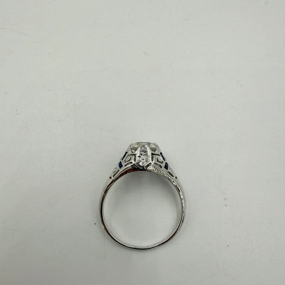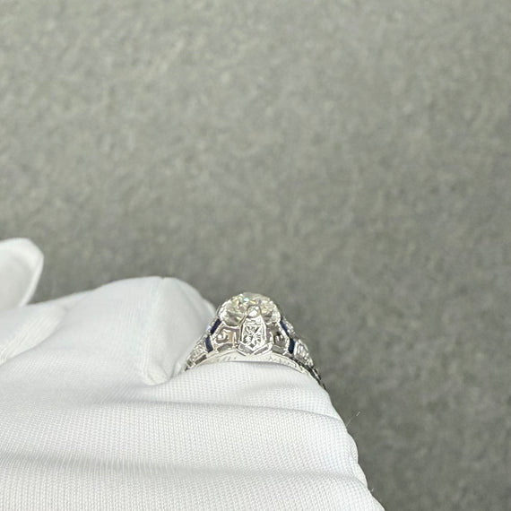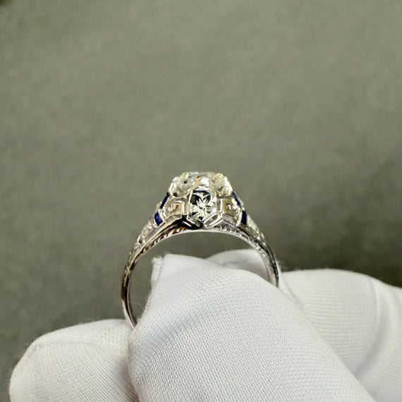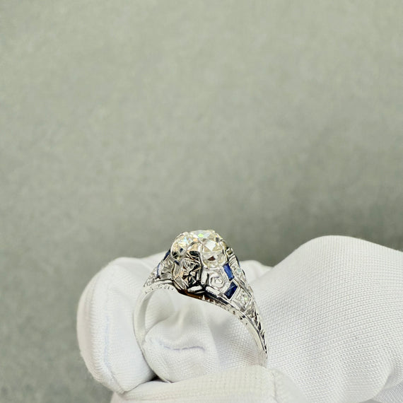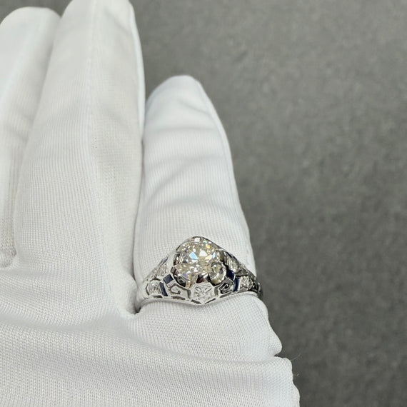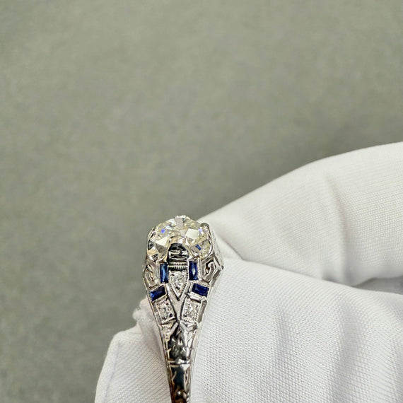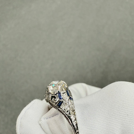 The Art Deco 18k White Gold Engagement Ring from around 1925 has approximately 1 carat of diamonds total weight. The center Old European Diamond weighs approximately 0.95 carat and is set as the focal point of this Art Deco crown-style setting. The sides have pierced and engraved work along with six smaller round diamonds and 8 calibrated french cut blue stones. What a lovely ring. It will make that special person very happy!
