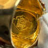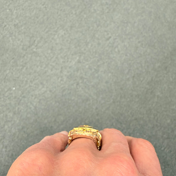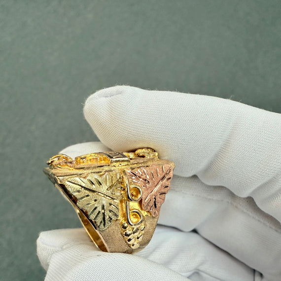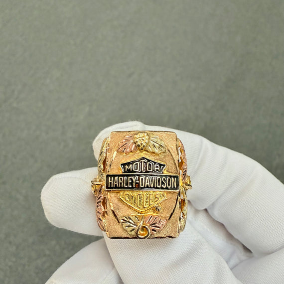 This Harley Davidson Blackhills 10k Tri Color Gold Ring was made in the late 1970s. Designed as a rectangular signet-style ring with the Harley Davidson emblem and then embellished with tri-color gold leaves. It's a very comfortable ring to wear and would make for a great gift for someone or yourself.