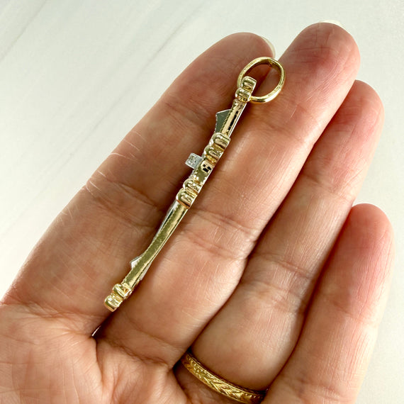 Large two tone diamond cross with a unique design. The bail is large enough to accommodate most chains. The pendant is 14k yellow and white gold but the bail is 18k yellow gold. In very good condition.