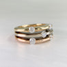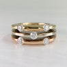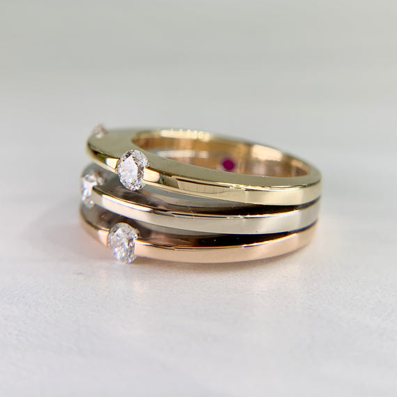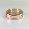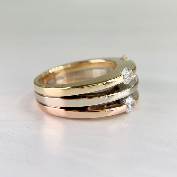 The Roberto Coin Diamond 18k Tricolor Gold Band Ring was made around 2010. The Rose, Yellow, and White gold rings were fused to give a striking look, further tension set with five round brilliant cut diamonds. Exceptionally well made and solid throughout.