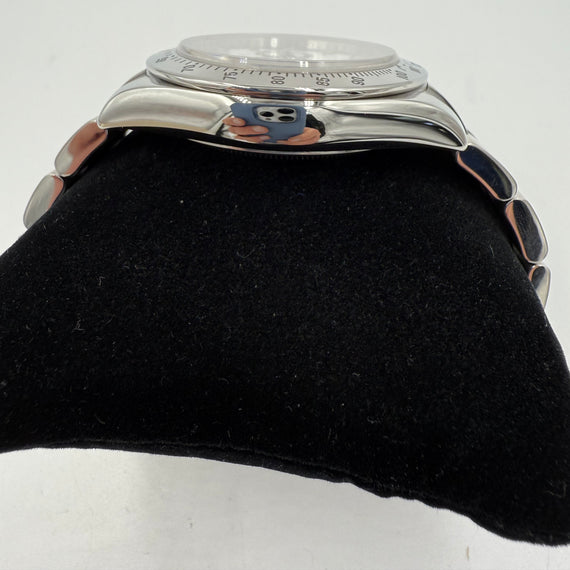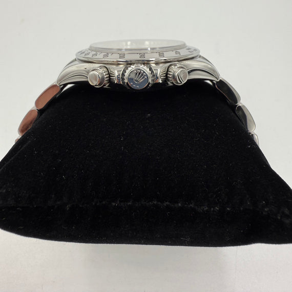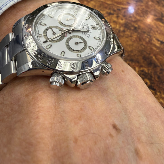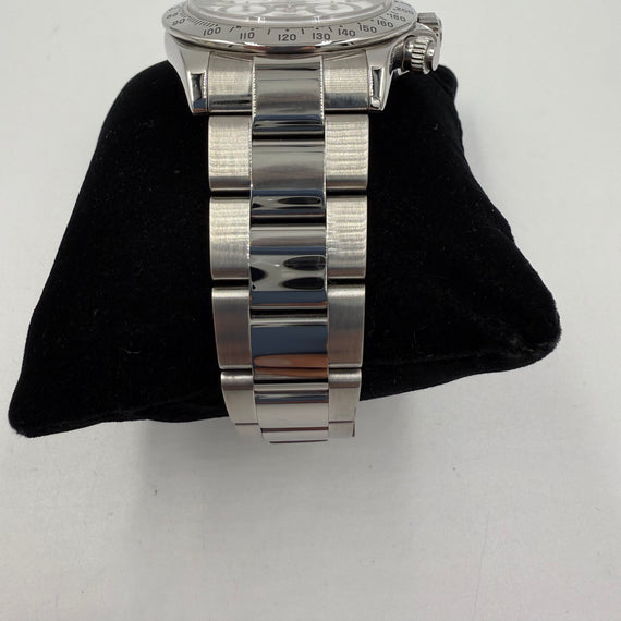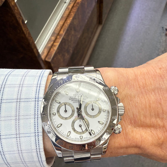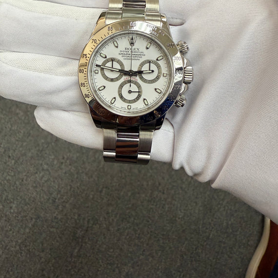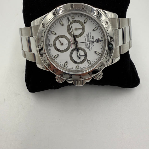 Rolex Daytona White Dial Stainless Steel Wristwatch Model #116520. This watch is in very good condition. It's an automatic winding chronograph, 44 jewels, with a sapphire crystal. The dial is white with white hour markers. And the case is 40mm in diameter. The bracelet is an Oyster bracelet with a flip-lock clasp. It's a great watch to give as a gift or perhaps a gift for yourself!