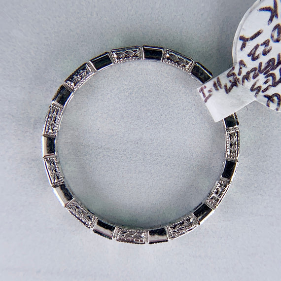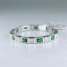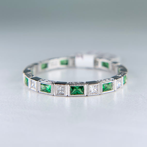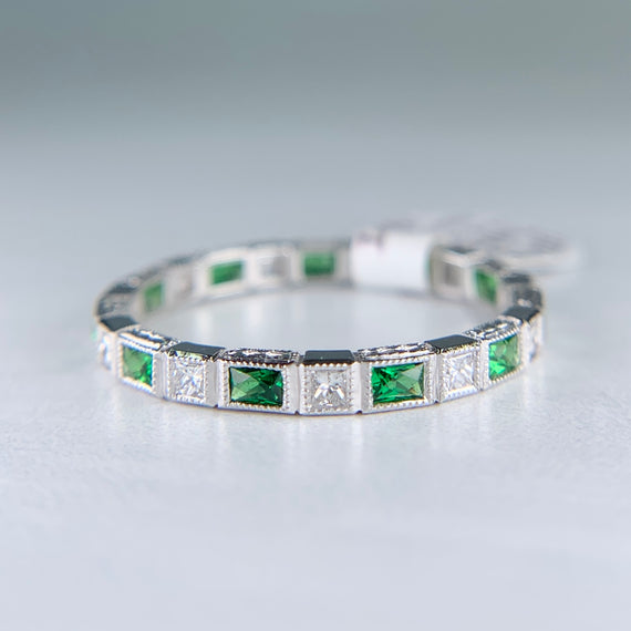 Gorgeous and vibrant tsavorite and diamond eternity band. Perfect for stacking and to add a pop of color. The profile features some lovely engraving. In excellent condition.